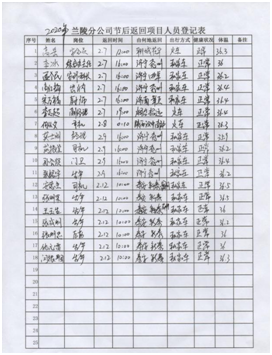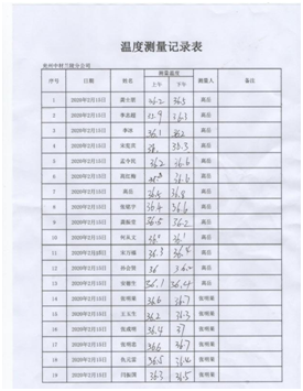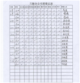 配合當地政府體溫監測 落實措施,扎實開展防控工作。分公司設立疫情防控點,配備防護口罩、手套、防護鏡、體溫計及測溫槍、酒精、84消毒液、噴霧器等防護物資。嚴格控制返程人員,對居住或經過疫情防控重點區域人員,要求暫不返回項目部,居家隔離自我觀察;要求返回項目部人員,返程路上嚴格落實個人防控措施,制定記錄表,對返回人員嚴格檢查、登記;返回項目部后,在項目部內自行隔離14天,每天早晚測量體溫并做好記錄。    返程人員登記 每日體溫監測 集中開展項目部衛生消毒工作。分公司通過多種渠道,購進酒精、84消毒液等藥品,每天上午下午各進行一次集中消毒工作,辦公室、會議室、廚房、餐廳、宿舍、衛生間、走廊、院內邊邊角角,全面消殺。  項目部消毒 消毒記錄