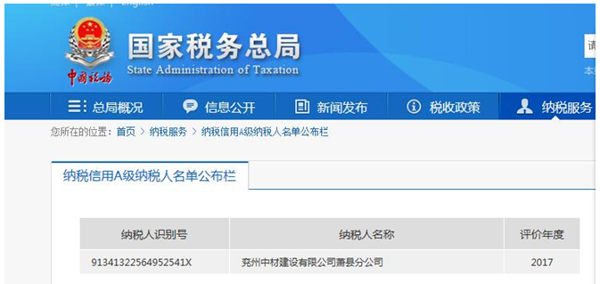 2018年6月15日,經(jīng)過在國家稅務(wù)總局官方網(wǎng)站查詢得知:兗州中材建設(shè)有限公司蕭縣分公司被評定為“A級(jí)納稅信用企業(yè)”。