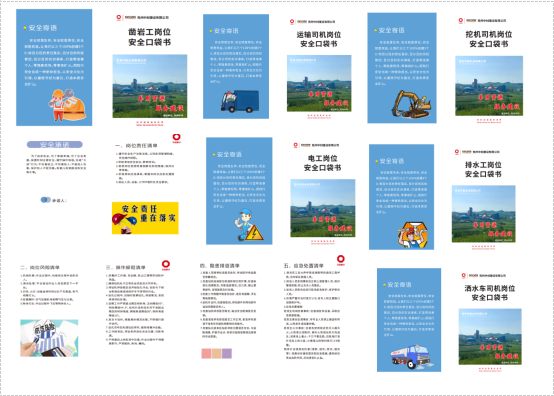 口袋書封面背頁以安全為主題,與生產相結合,內容包括安全文化標語、口號、個人安全承諾、具體崗位職責要求、風險辨識、操作規范、隱患排查、應急處置等。